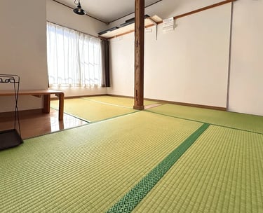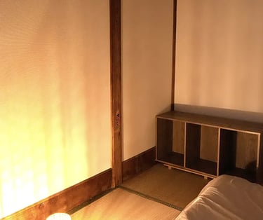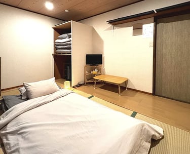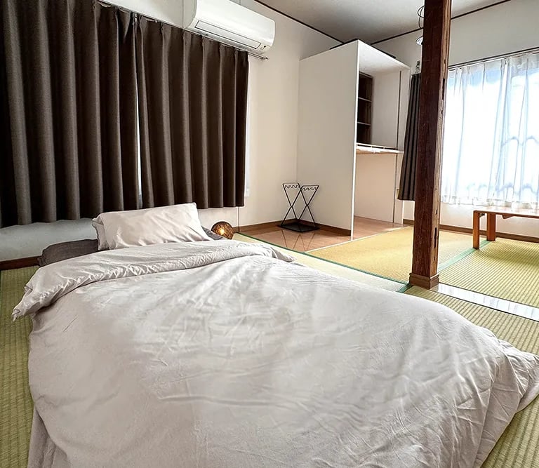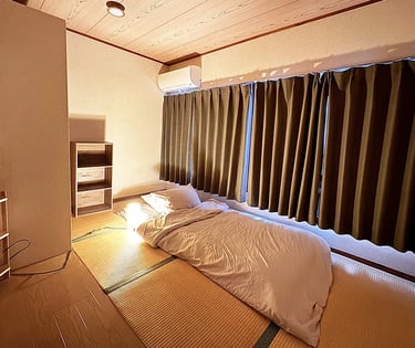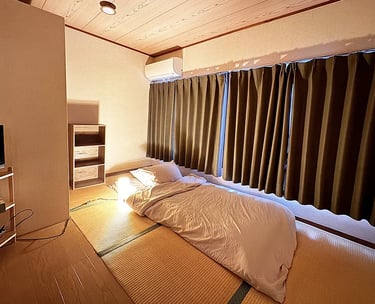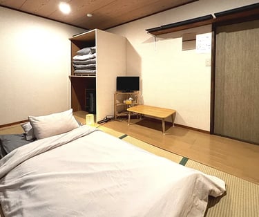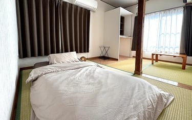 This traditional room is approximately 10㎡ and accommodates 1–2 guests. Experience the classic Japanese lifestyle with authentic futon bedding on straw-woven tatami floors.