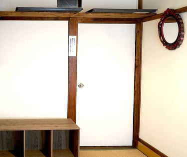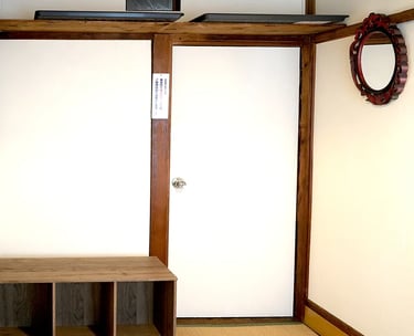 This bright and well-ventilated 10㎡ (6 tatami mats) room is a corner room facing the main street. Featuring vintage wooden pillars that evoke a traditional atmosphere, the room lets in plenty of natural light. It can accommodate up to two people, though it is more recommended for solo travelers. For storage, there is a large luggage shelf that can even store futons. The upper section is perfect for daypacks and personal belongings, while the lower section securely holds large suitcases. Enjoy the warmth of a traditional Japanese house in this bright and functional space.