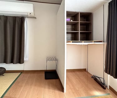 A compact yet highly functional 5㎡ (3 tatami mat) space designed for solo travelers who prefer minimalism. Although small in size, it is equipped with a work table, storage shelves, and a wooden shelf above the entrance, all thoughtfully designed to maximize storage for small items.